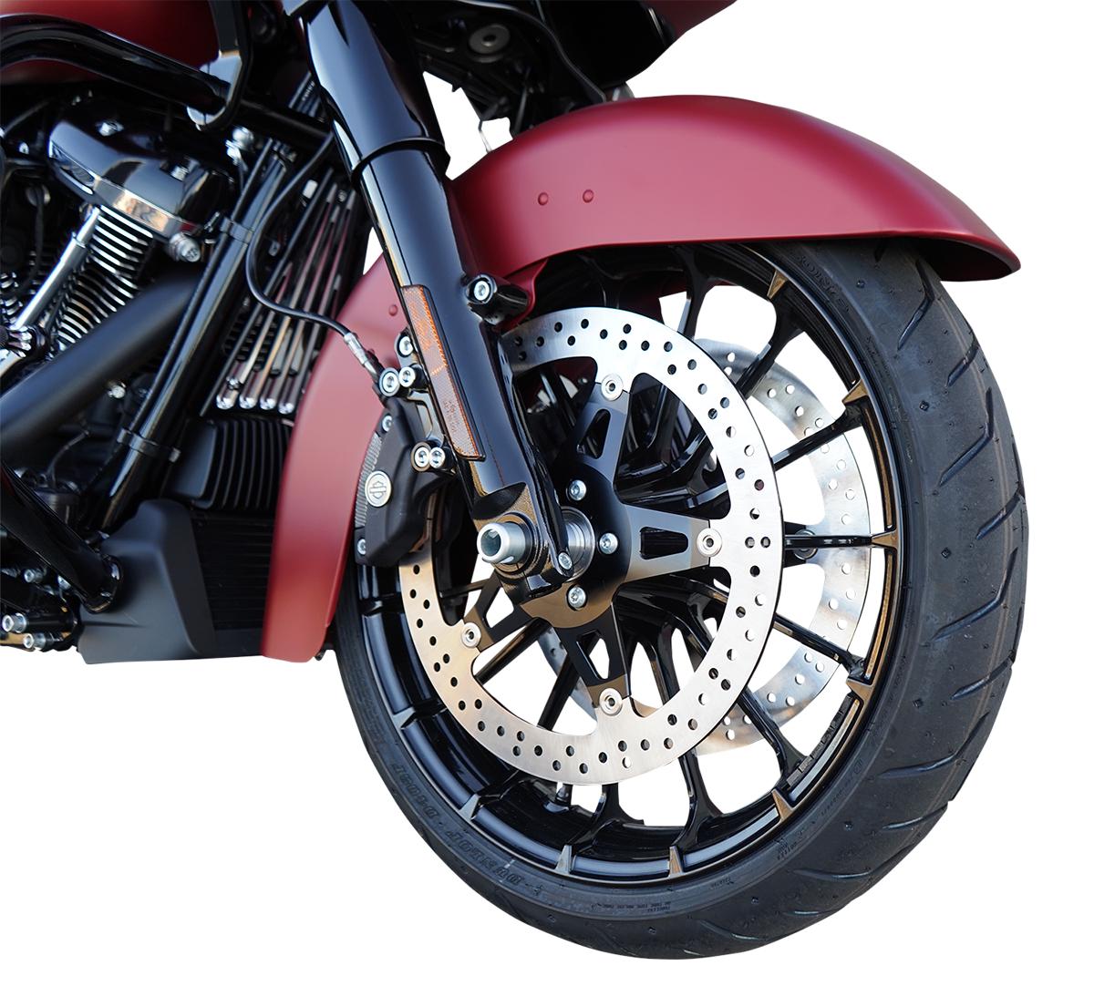 Used with 17" or larger front wheels. Bolt-on installation. Oversized brake rotors from 420 stainless steel for a big increase in performance styling. Comes with a billet aluminum brake caliper bracket and all necessary hardware to make a smooth transition from stock to a true Arlen Ness set-up that will turn heads. Stock calipers and brake lines can be re-used.