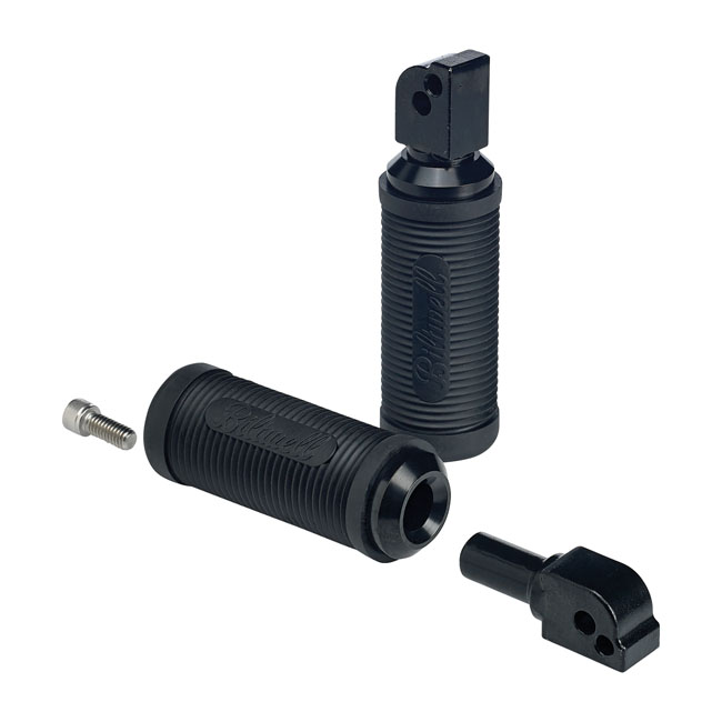 Manufactured from a 6061-T6 CNC-turned aluminum core with a black electroplated finish and a black PVC rubber sleeve, resembling the stock 70's H-D footpegs. The investment cast chromoly H-D male mount clevis can be rotated to the preferred angle and, with Loctite on the thread of the center allen bolt, fixed in place. Classic and quality combined!