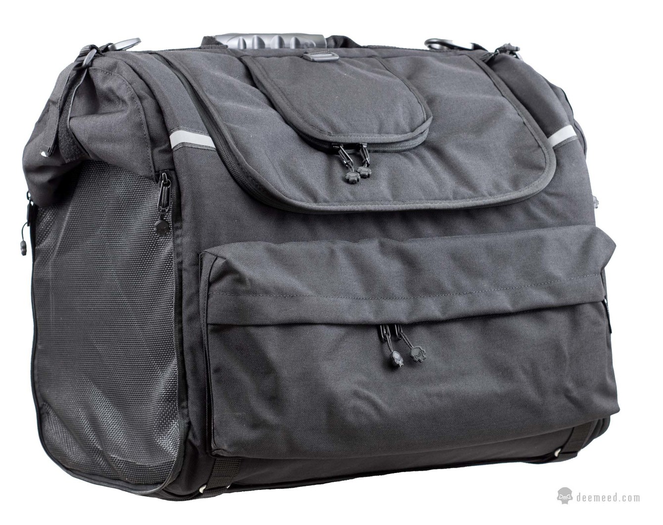 Mesh flap, fabric flap and panoramic opening closed with locks. Sides of the bag both open or one of them closed (the one on the exhaust side)