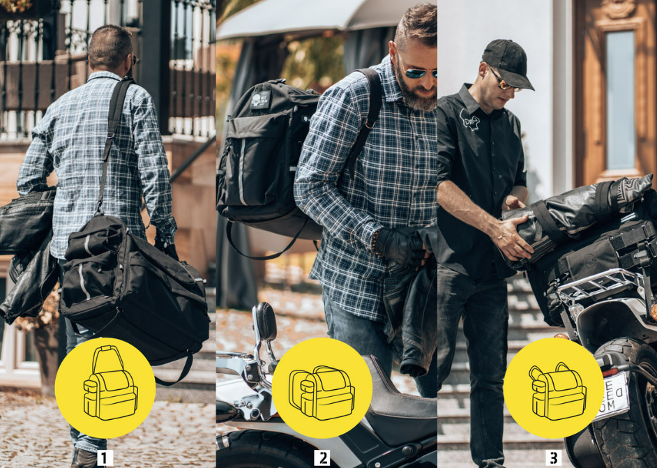 When you need to walk with your bag from the motorcycle to the hotel. Throw the bag over your shoulder and carry extra stuff. - 2ND FUNCTION - Backpack