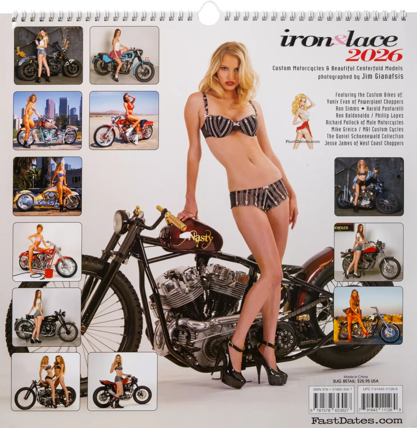 2026 Iron & Lace Calendar features top custom motorcycles from builders Jesse James / West Coast Choppers, Ron Simms / BayArea Customs, Harold Pontarelli, Yaniv Evan / Powerpant Choppers, Mike Greico, The Daniel Schoenwald Collection, Ron Baldonado, Richard Pollock / Mule Motorcycles.