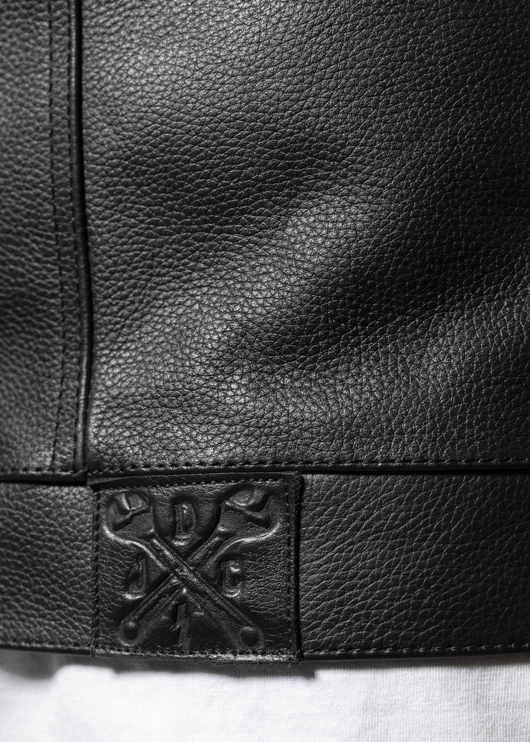 Den är tillverkad av ett kraftigt men behagligt svart skinn och ett mjukt foder.