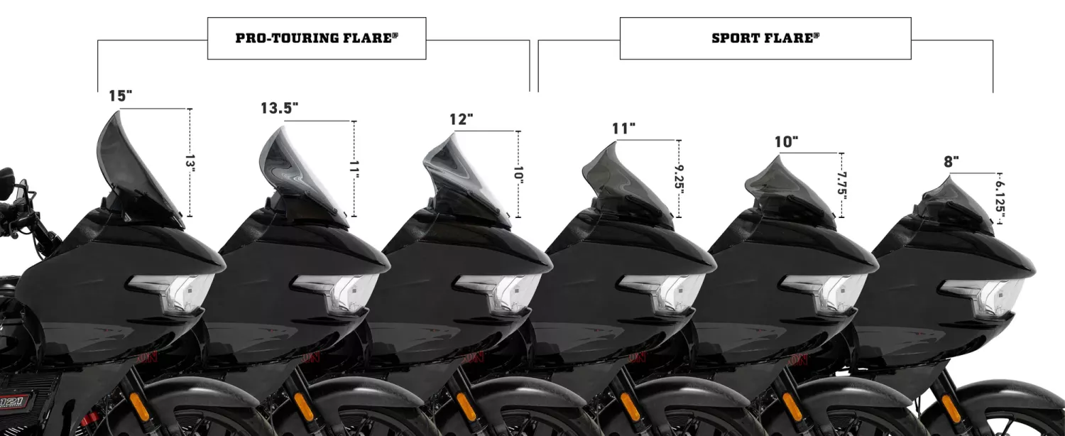 - Pro-Touring Flare®: For those seeking maximum protection and comfort on longer rides, not just for you, but your passenger as well! This wider version offers increased wind deflection while retaining the Flare's distinctive style and stability-enhancing features.
