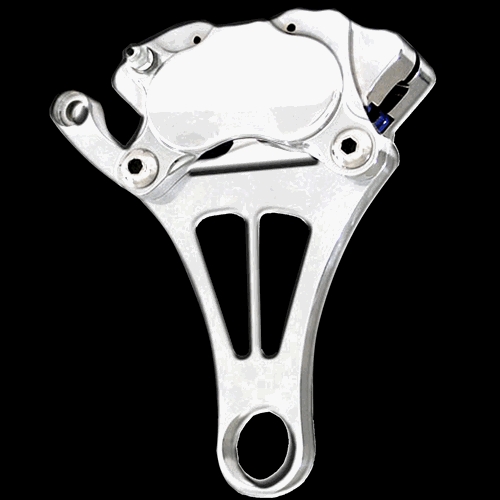 Kromat 4-kolvs ok inkl bromsbelägg med kromat fäste och länkarm för montering på höger sida på springergaffel.