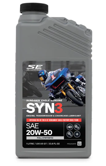 Developed with a proprietary three synthetic basestock formula, Screamin' Eagle® SYN3™ Lubricant is formulated to provide for long-term protection and engine cleanliness requirements, and to provide superior high-temperature protection for high-output engines.