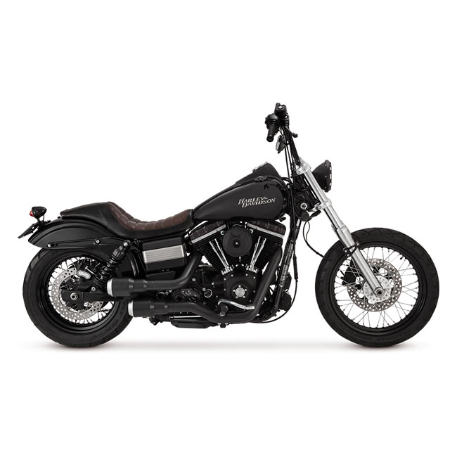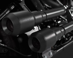 Black with black end cap. These are a blast! Just by looking at them the message is instant and clear. Power and tough is written all over this system with its 'form is function' no-nonsense design. Clearly visible are the three-step headers, to maximize the scavenging effect for torque without end. The Hi-Output Grenades feature a 4" 3-step muffler body, 2-1/4" heat pipe heat shields and 1-3/4" head pipes. End-caps are available in three finishes to even more personalize this Hi-Output system. Sound, you say? Aggressive, deep and ready for battle! Installation of the Grenades requires removal of passenger pegs, and in case of saddlebags, requires removal of the right bag. Includes the Super Bung which is 12 and 18 mm O2 sensor compatible. Note: 87-06 Softails require 981623 O2 sensor plug-off plugs. Note: 86-99 Softail require 559169 passenger footpeg relocation bracket, which is sold separately. Note: 00-17 Softail require 559168 passenger footpeg relocation bracket, which is sold separately. Note: See 982432 for optional quiet baffle.